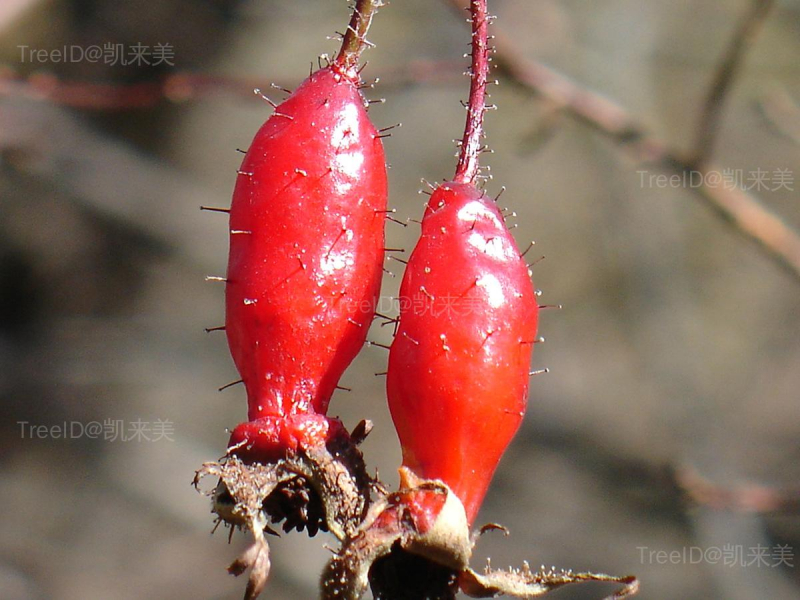 果长椭圆形或长倒卵球形,顶端有长颈,深红色或桔红色;果梗密被柔毛和腺毛,萼片宿存直立。