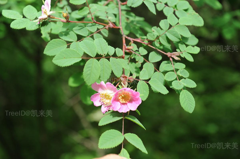 小叶7-11,广椭圆形至卵状椭圆形,边缘有尖锐锯齿,近基部全缘。花单生或数朵聚生,粉红色或紫红色。果卵形,深红色。