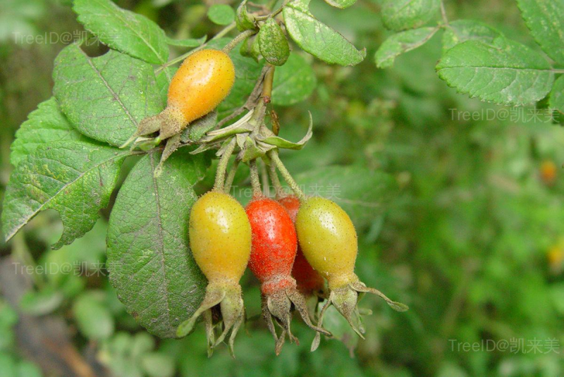 小叶7-11,椭圆形至卵状长圆形,边缘有重锯齿。花单生或2-3朵簇生;花瓣粉红色。果长圆形,红色,外面常有腺毛,萼片直立宿存。