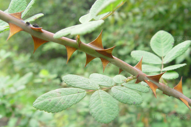 小枝圆柱形,有直立或稍弯曲,基部膨大而扁, 平皮刺,有时老枝常混有针刺。
