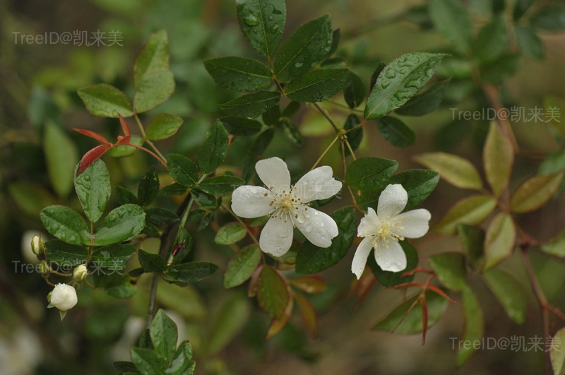 小叶3-5,椭圆状卵形,边缘有紧贴细锯齿。花小,多朵成伞形花序,花直径1.5-2.5厘米;花瓣白色;果球形至卵球形,直径5-7毫米,红黄色至黑褐色。