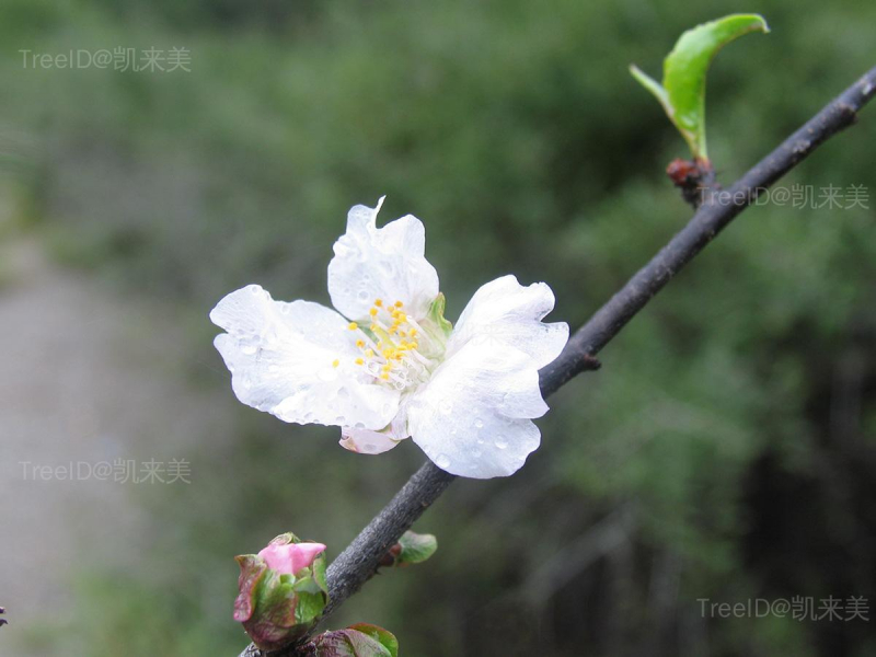 叶簇生或互生,长椭圆形,先端有小尖头,边缘有锯齿。花单生,无梗或近无梗。果实近球形或卵球形,紫红色,外面密被柔毛,成熟时开裂;核近球形。