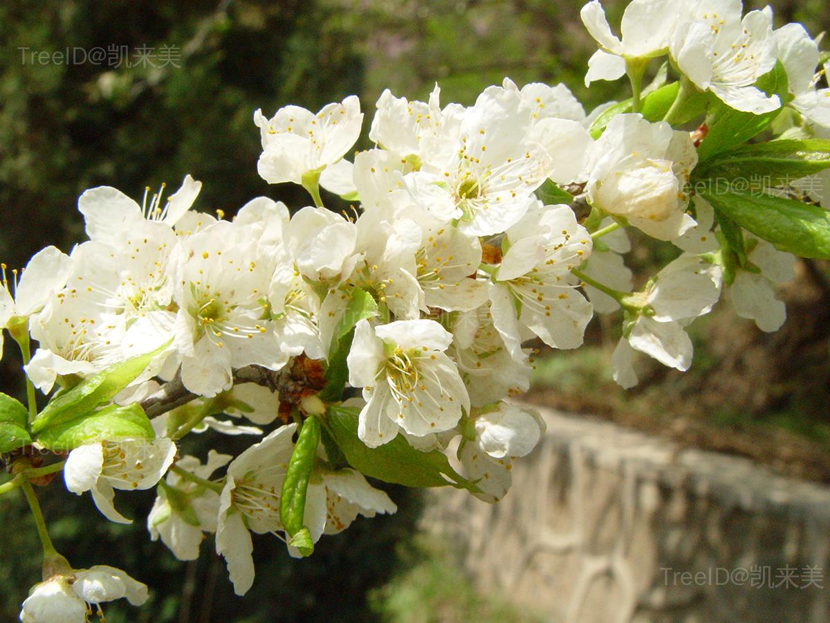 叶倒卵形,边缘有细密锯齿。花先叶开放,通常3朵簇生;花瓣白色。核果卵球形,基部凹陷,绿色、黄色或浅红色,有光泽,外有蜡粉。
