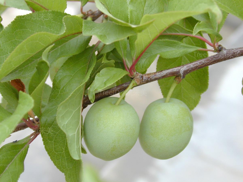 核果球形,直径3.5-5厘米,黄色或红色,有时为绿色或紫色,梗凹陷入,顶端微尖,外被蜡粉。