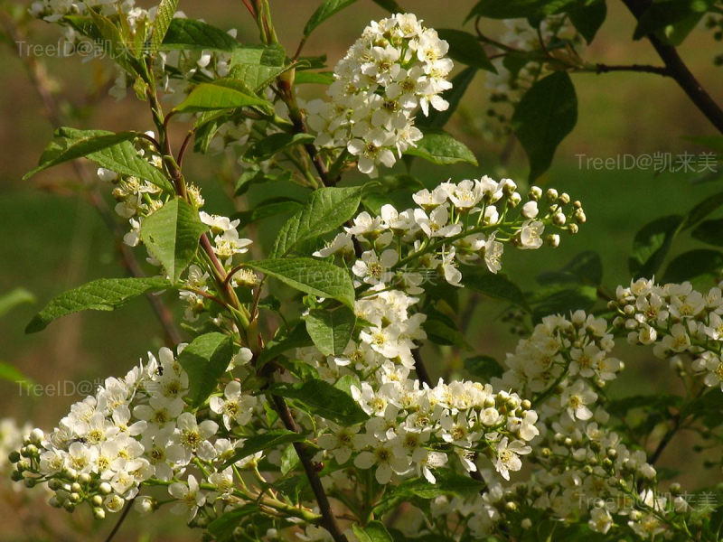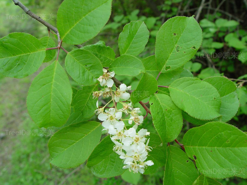叶片椭圆形,长4-10厘米,宽2-4.5厘米,边缘有不规则锐锯齿。总状花序多花,长7-10厘米;花瓣白色。核果卵球形,红褐色至黑色。