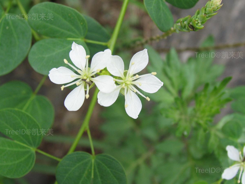 伞房式总状花序侧生,连总花梗长1.5-3厘米,有密集的花十余朵;苞片线形,早落;萼佛焰状,裂片2;花瓣白色,倒披针形;能育雄蕊通常10枚,其中5枚较长。