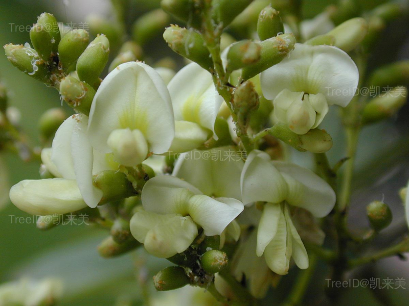 羽状复叶具小叶4-7对,小叶卵状披针形,先端具小尖头。圆锥花序顶生;花冠白色或淡黄色,有紫色脉纹。荚果串珠状,熟后不开裂。