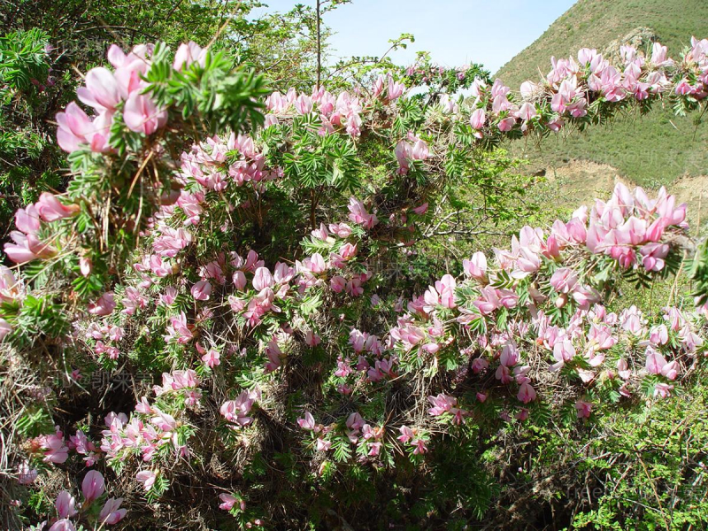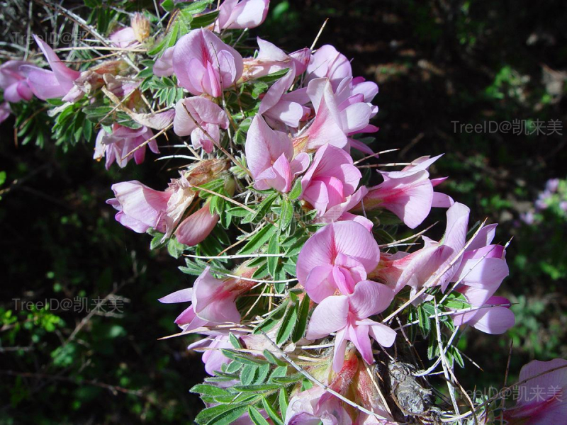 叶轴全部宿存并硬化成针刺状;小叶8-12,长椭圆形,先端有针尖,两面疏生柔毛;花单生;花冠紫红色。荚果长椭圆形,密生丝状长柔毛。
