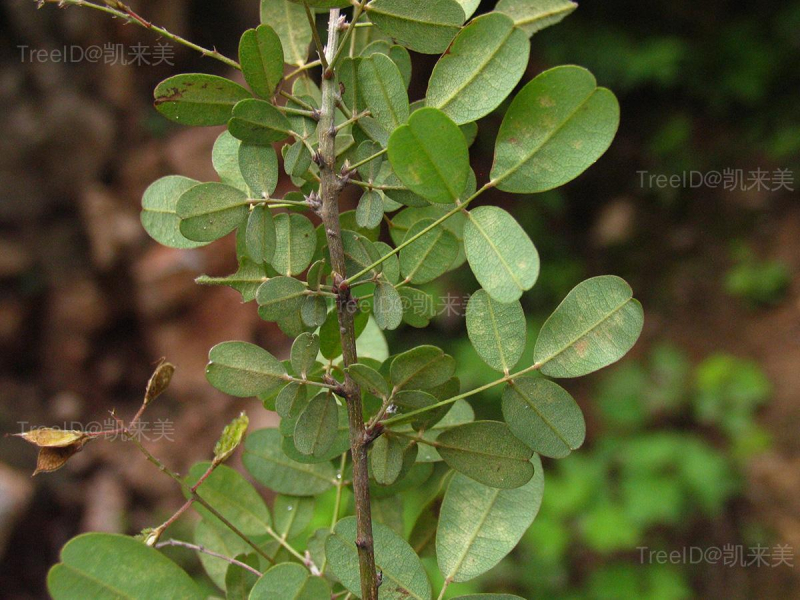 羽状复叶具3小叶;托叶狭三角形;叶柄长1-3.5厘米;小叶椭圆形或宽椭圆形,长2-7厘米,宽1.5-3.5厘米,先端具小凸尖,下面贴生柔毛。