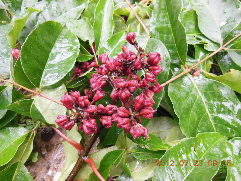 蓇葖果紫红色,干后变棕色,顶端有芒尖。