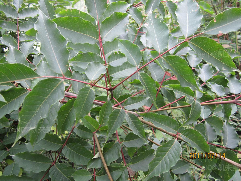 羽状复叶有小叶5-11片,小叶纸质,阔卵形或卵状椭圆形,长6-15厘米,宽3-7厘米,散生少数油点,叶缘有细钝裂齿。