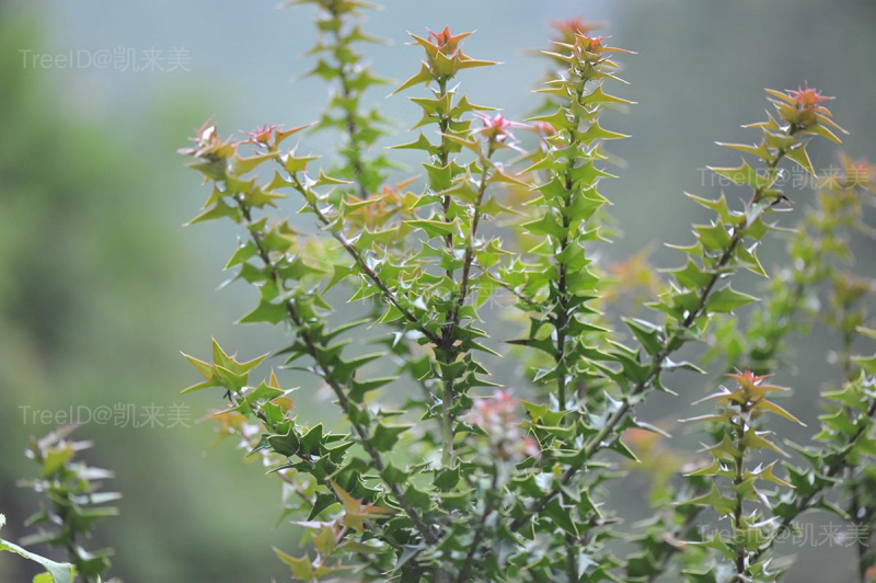 叶片革质,卵形或卵状披针形,长1.5-3厘米,宽5-14毫米,先端三角形渐尖,粗刺状,边缘具深波状刺齿1-3对,中脉在叶面凹陷;托叶三角形,急尖。