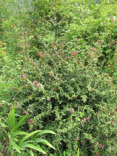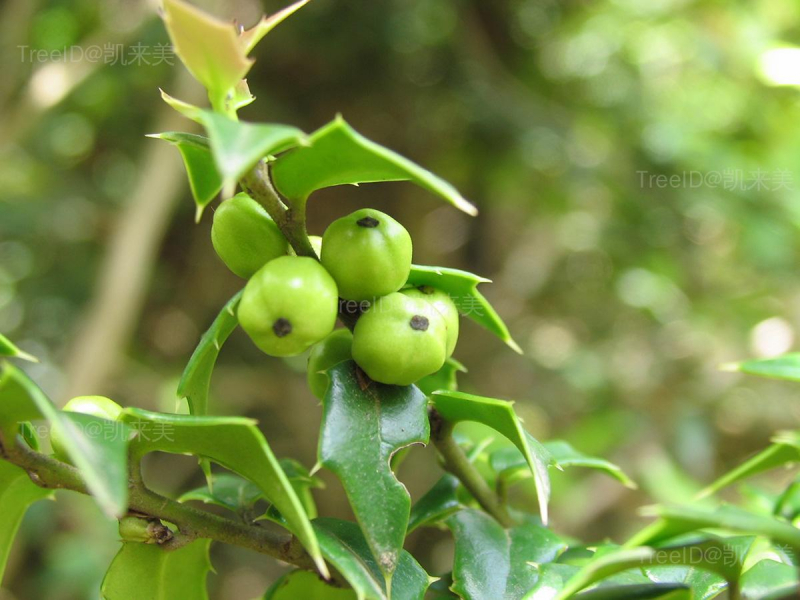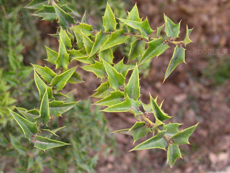 叶革质,卵形,顶端急尖,刺状,边缘具1-3对大刺齿;叶柄极短。雌雄异株,花4数,花序簇生于叶腋。核果近球形,红色。