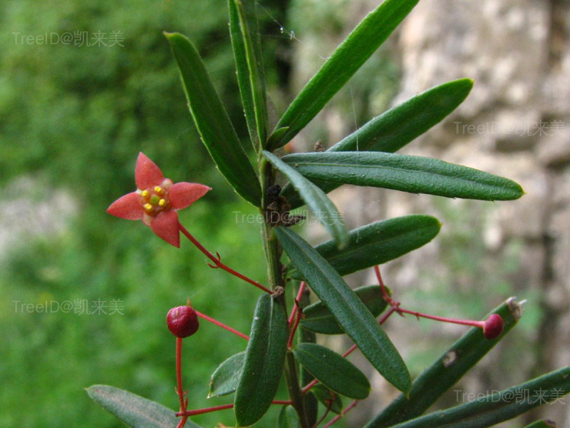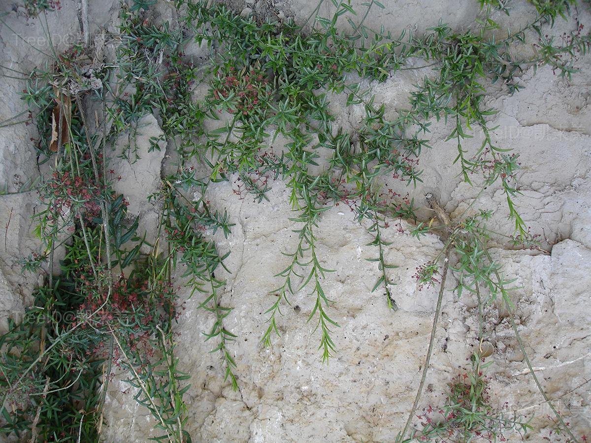 叶互生或三叶轮生,线形或线状披针形,边缘具稀疏短刺齿,常反卷。聚伞花序1-3花;花紫绿色,4数。蒴果扁圆,4浅裂,直径约9毫米。