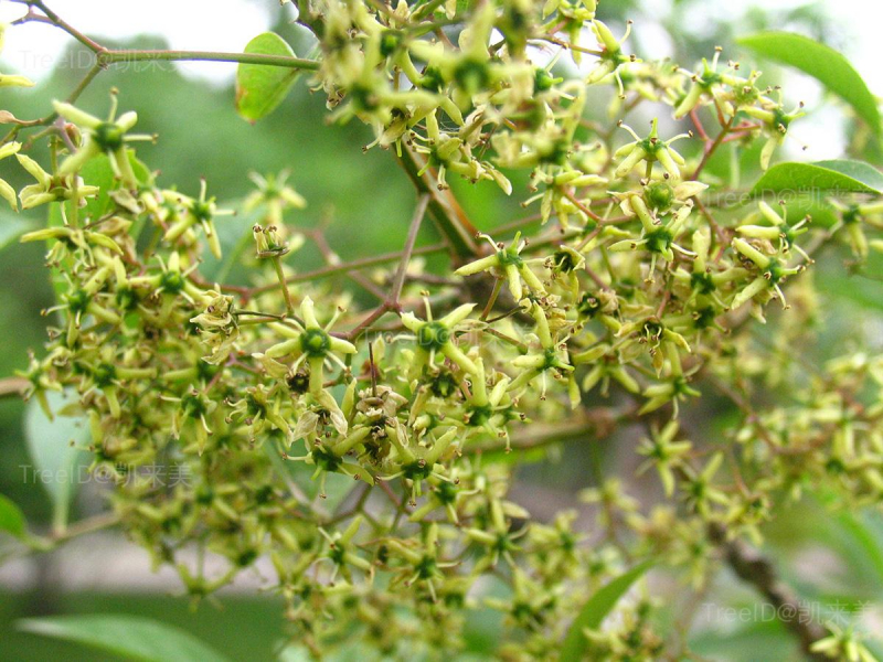 聚伞花序2-3次分枝,有花7-15朵;花白绿色,直径约8毫米,4数。