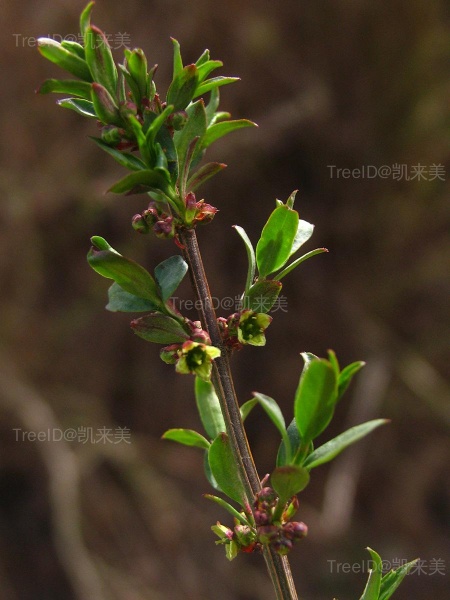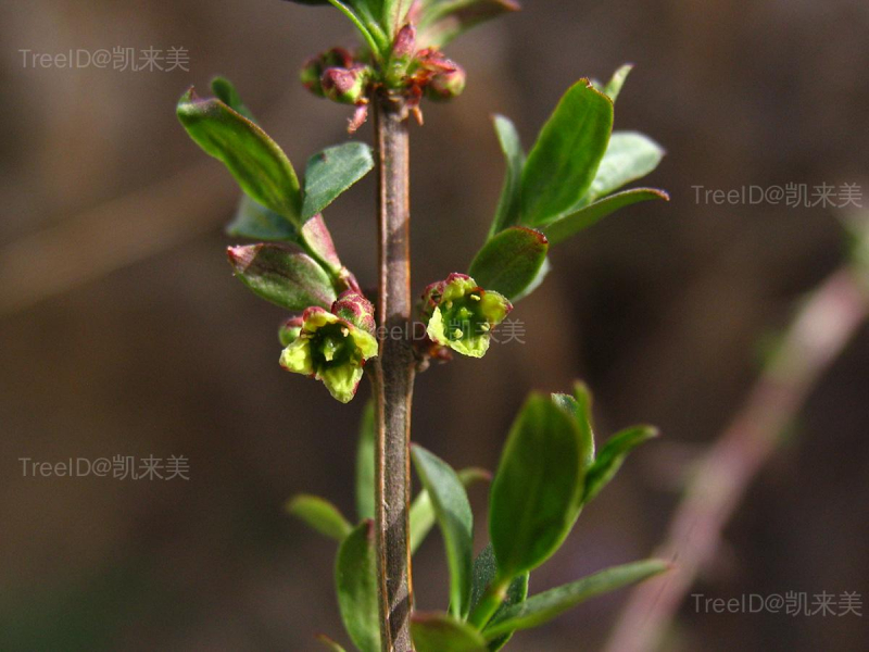 单叶对生,椭圆披针形至窄长椭圆形,长1-2厘米,宽2-8毫米;叶柄极短。聚伞花序有花1-2朵;花黄绿色,4数。蒴果,近圆球状,上部1-4浅裂;种子紫褐色,假种皮橙色,全包种子。