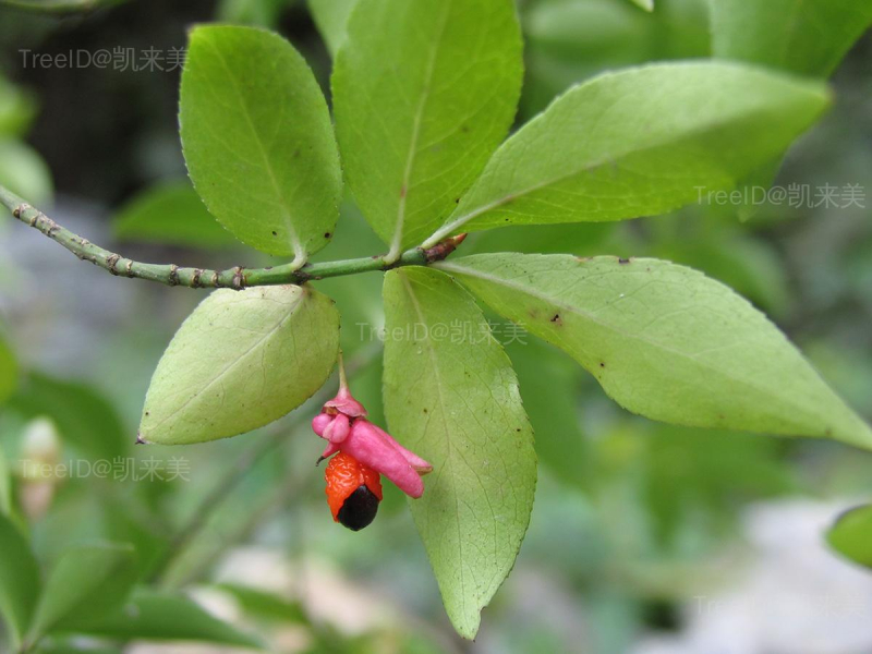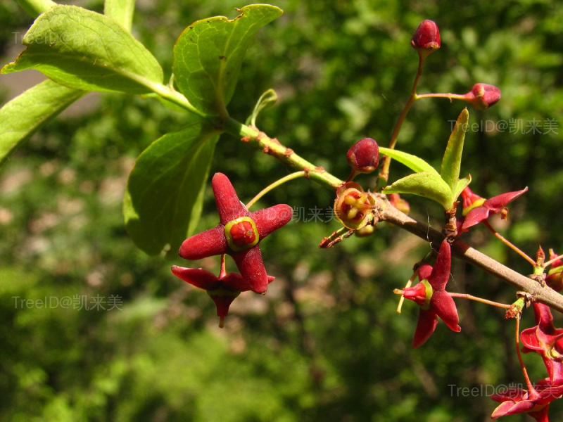 单叶对生,厚纸质,倒卵形至阔披针形,长3-7厘米,宽2-3厘米,缘具疏浅细齿;叶柄短。聚伞花序具2-5花;花紫红色或淡绿紫色,4数。蒴果1-4全裂。