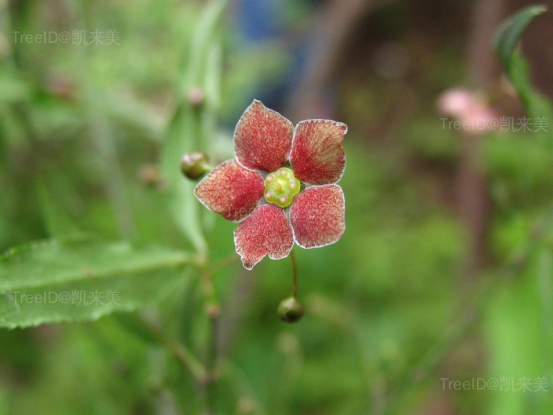 聚伞花序具3-7花;花序梗细长,长3-5厘米;小花梗长1-1.2厘米;花紫红色或暗紫带绿,直径约1厘米,花4数或5数;萼片肾圆形;花瓣倒卵形或近圆形。