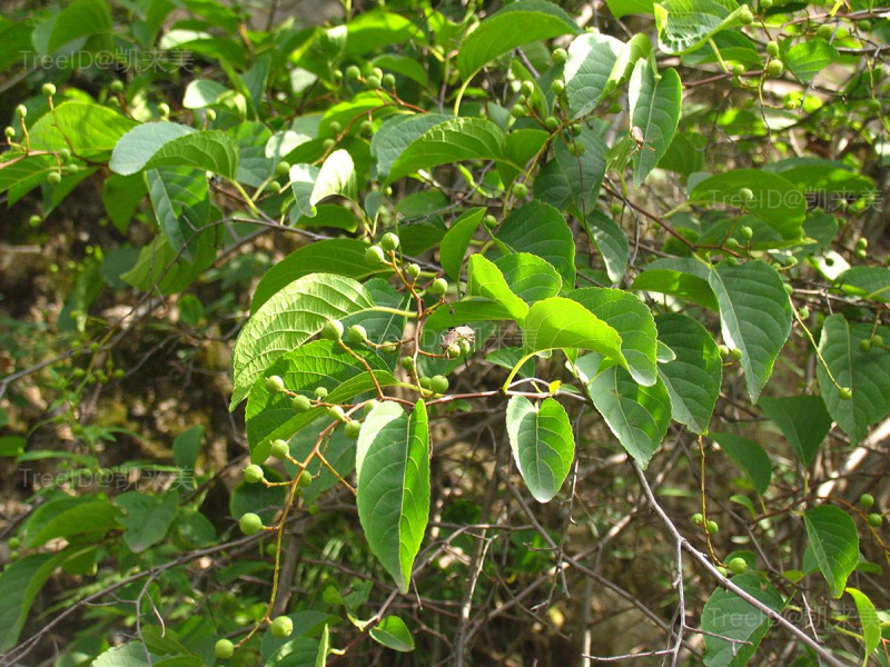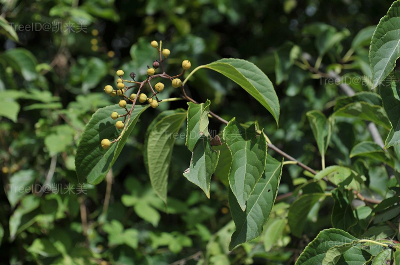 叶近革质,长方阔椭圆形,长7-17厘米,中央具尖头;叶柄长1.5-3厘米。聚伞圆锥花序顶生,长10-20厘米;小花梗较短;花瓣5,黄绿色。蒴果近球状,直径8-10毫米,熟后3瓣裂。