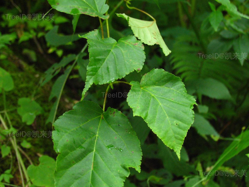 叶卵形,长7-9厘米,宽5-6厘米,边缘具密而尖锐的重锯齿,基部心形,5裂;中裂片三角形;叶柄长2-3厘米。花淡黄绿色,单性,雌雄异株,常成细瘦下垂的总状花序。翅果熟后黄褐色;翅张开成钝角或近于水平。