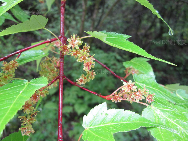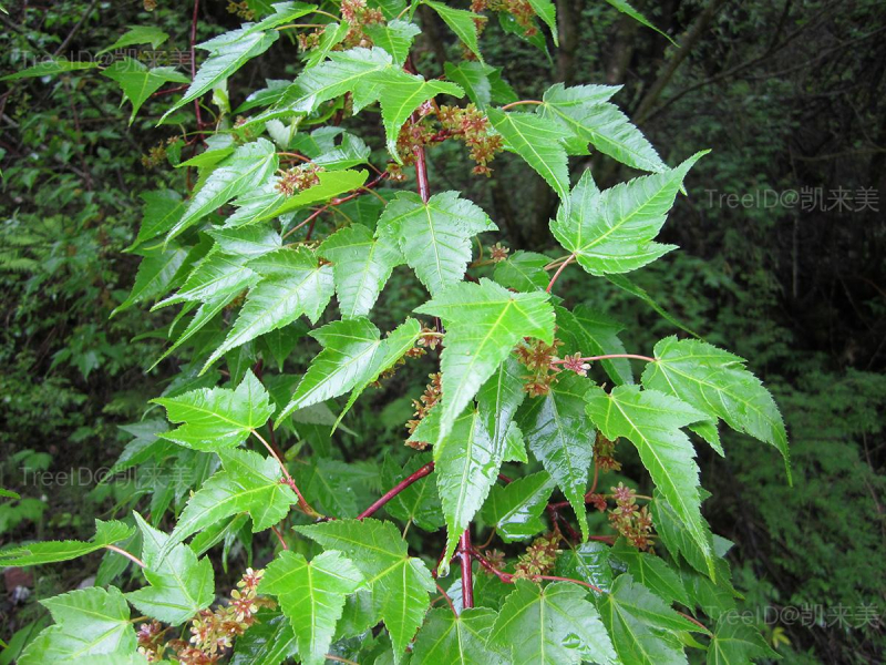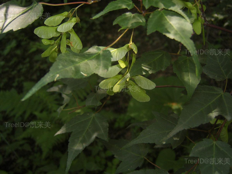 单叶对生,卵形,长8-11厘米,常5裂;裂片边缘具重锯齿,中央裂片先端尾状锐尖;基部近于心形;叶柄长5-7厘米,细瘦。总状花序长4-8厘米,下垂;花黄绿色或带紫红色,5数。翅果张开成钝角。
