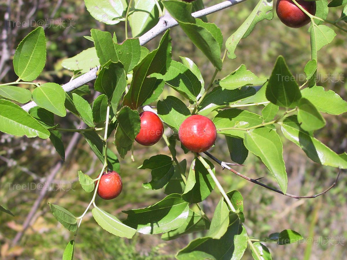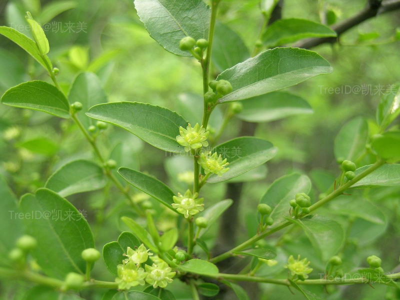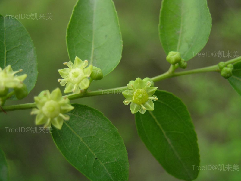单叶互生,长1-2.5厘米,椭圆形至卵状披针形,缘具细钝锯齿。花小,黄绿色,5基数,单生或2-8个密集成腋生短聚伞花序。核果近球形或短矩圆形,直径0.7-1.2厘米,熟后红紫色;果味酸,果核两端钝。