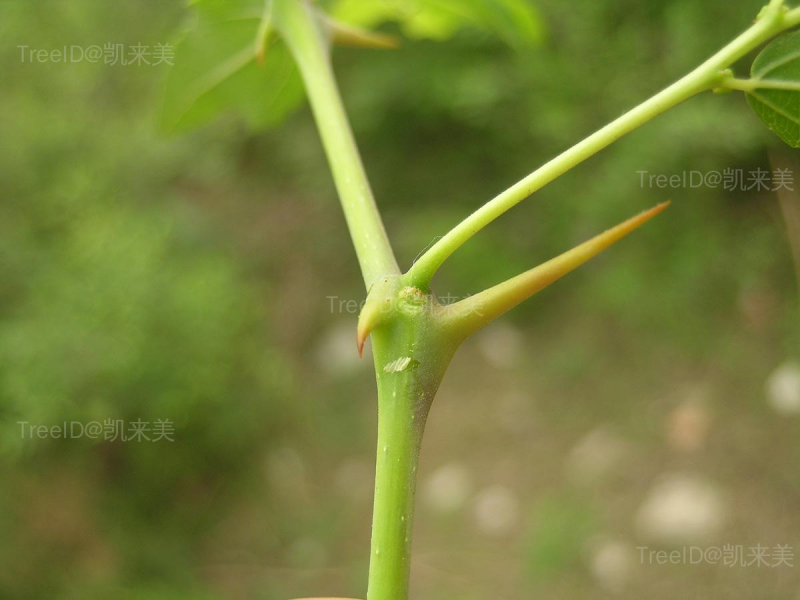 有长枝,短枝和新枝紫红色,呈之字形曲折,具2个托叶刺,长刺粗直,短刺下弯。