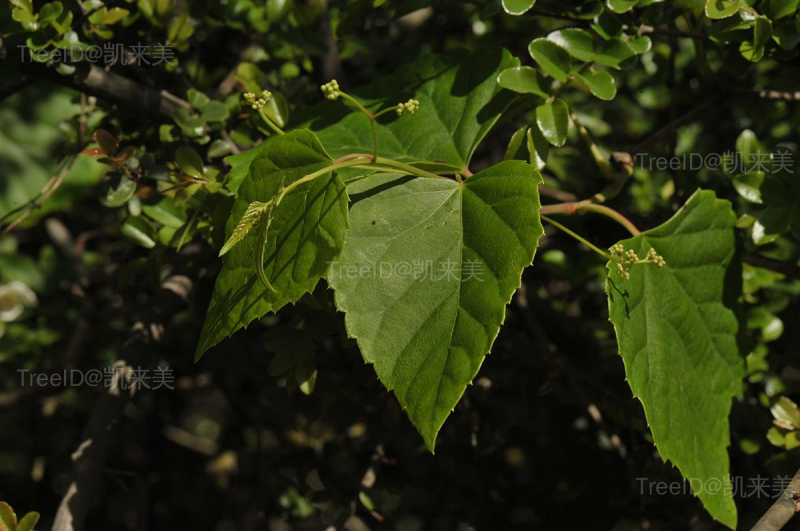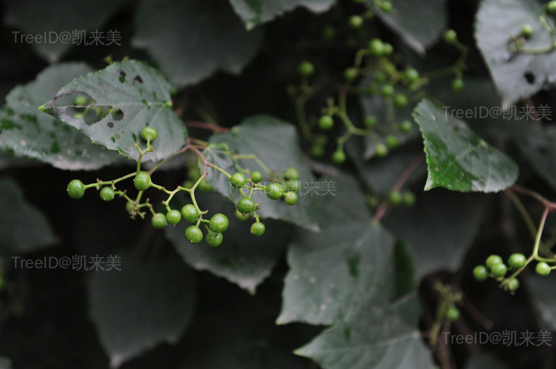 叶为单叶,纸质,宽卵形、三角形或五角状卵形,基部浅心形、截状心形或截形,不分裂或上部3浅裂,边缘有小牙齿。聚伞花序与叶对生;花小,黄绿色。浆果近球形,直径5-9毫米,熟后蓝紫色。
