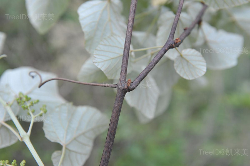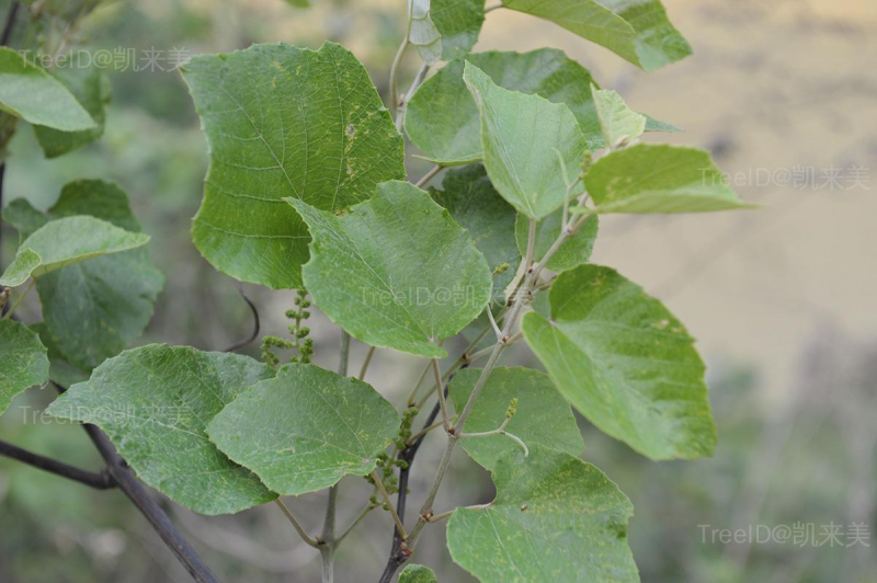 叶卵圆形或卵状五角形,长4-12厘米,宽3-8厘米,基部心形或微心形,边缘具尖锐锯齿,下面密被灰色或褐色绒毛;叶柄长2.5-6厘米;托叶膜质,卵披针形。