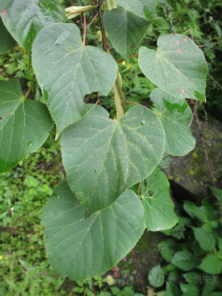 叶阔卵形,长5-10厘米,宽4.5-9厘米,基部斜心形或近截形,下面被灰色星状茸毛,边缘密具细锯齿;叶柄长3-5厘米,稍粗壮,被灰色毛。