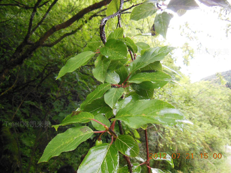 叶薄纸质,长方卵形或椭圆披针形,长4- 8厘米,宽2-4厘米,顶端长渐尖,基部不对称,边缘有细锯齿,有时上部变为白色;叶柄红色,长1.2-3.5厘米。
