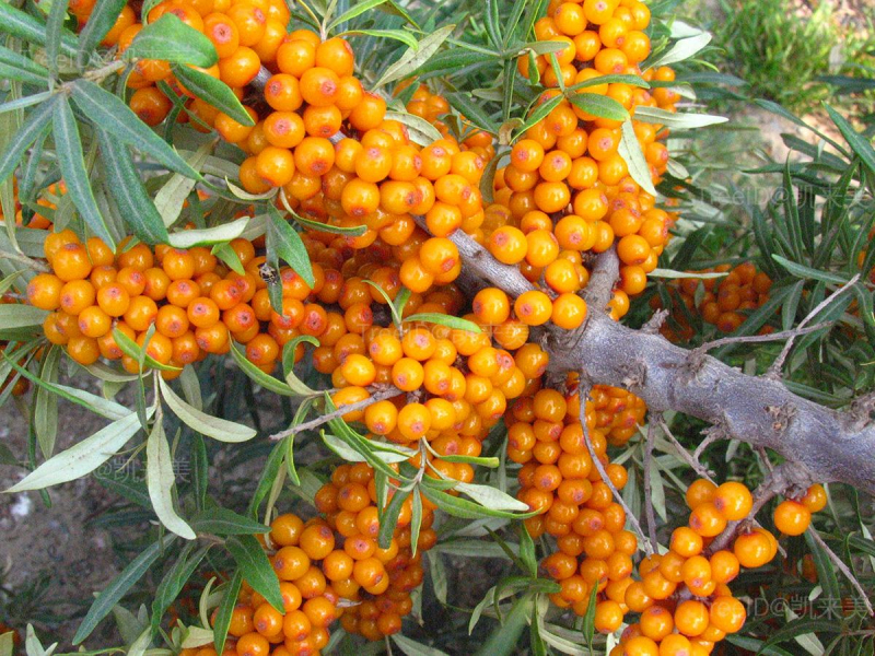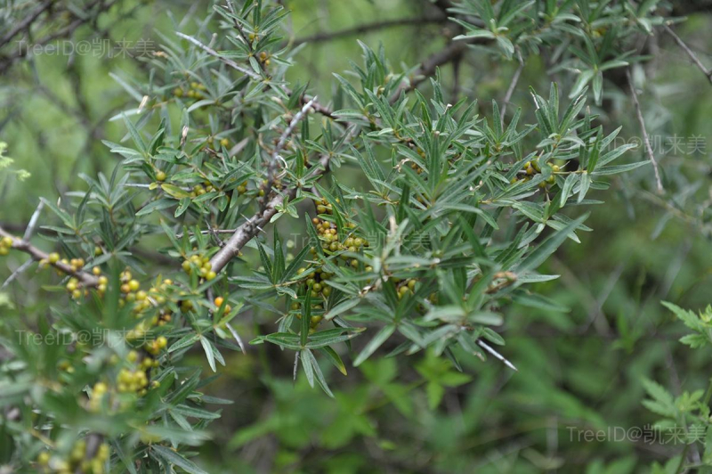 单叶近对生,狭披针形,下面银白色,被鳞片;叶柄极短。花小,淡黄色,顶端2裂。瘦果浆果状,圆球形,橙黄色或桔红色。