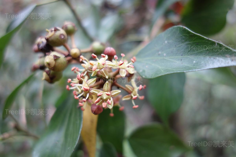 叶革质,三角状卵形,长5-16厘米,全缘或1-3裂;叶柄长2-9厘米。伞形花序单个顶生,有时2-7个总状排列或伞房状排列成圆锥花序;花淡黄或淡绿白色。果实球形,红色或黄色,直径7-13毫米。