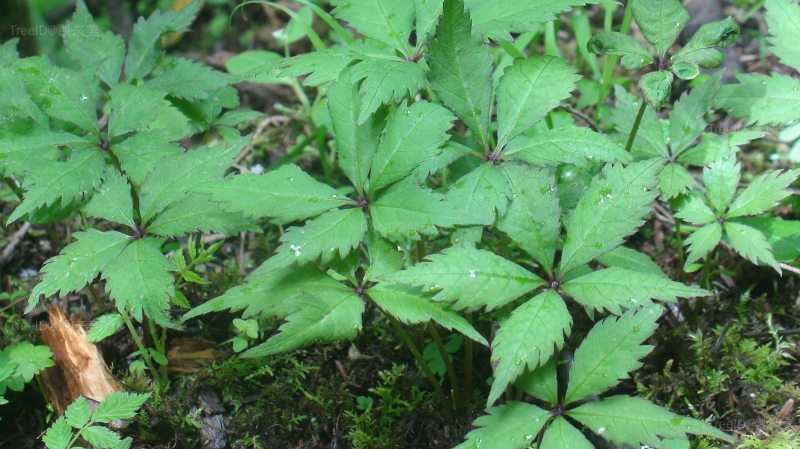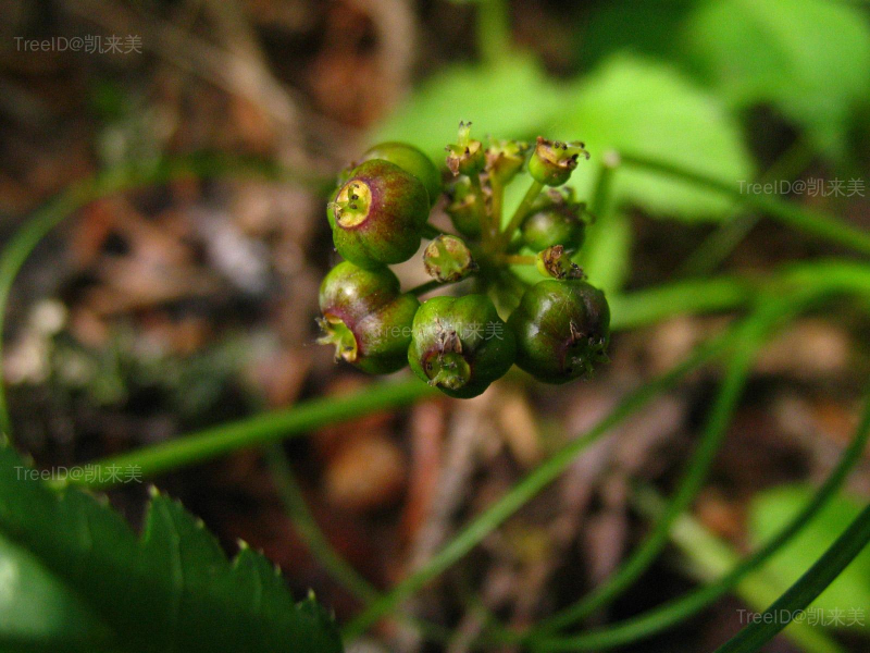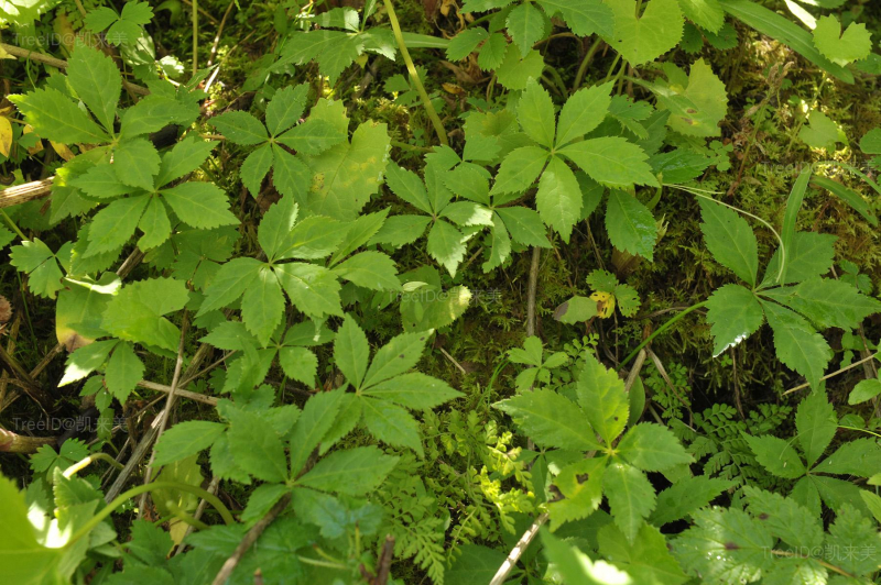 叶近对生;叶柄长4-8厘米;小叶5,稀3,倒卵形或椭圆状菱形,长3.5-6厘米,宽1.8-2.5厘米,边缘具重锯齿。伞形花序单生枝顶,直径1.5-2厘米;花瓣淡白色。果实近球形,黑色。