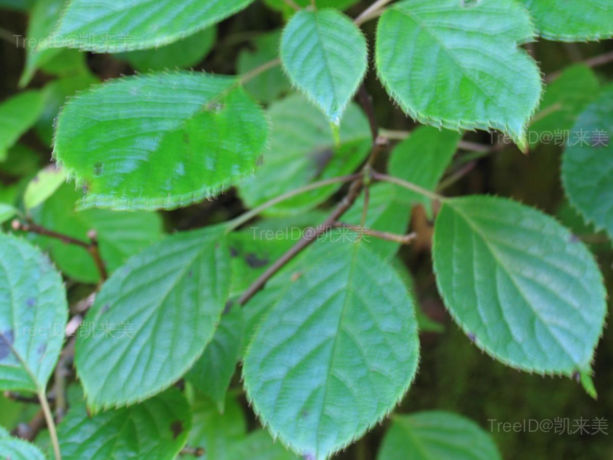 叶卵形,长3.5-18厘米,宽2-8.5厘米,边缘具刺状细锯齿;叶柄长1-6厘米;托叶线状分裂。