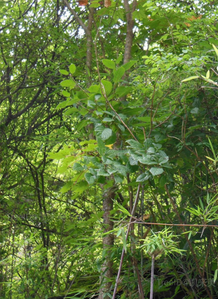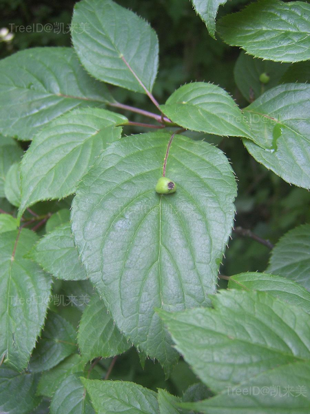 单叶互生,叶卵形,长3.5-18厘米,宽2-8.5厘米,边缘具刺状细锯齿;叶柄长1-6厘米。花淡绿色,3-5数;雄花4-12朵呈伞形花序,雌花1-3枚簇生,均着生于叶上面中脉近中部。核果浆果状,熟后黑色。