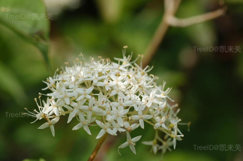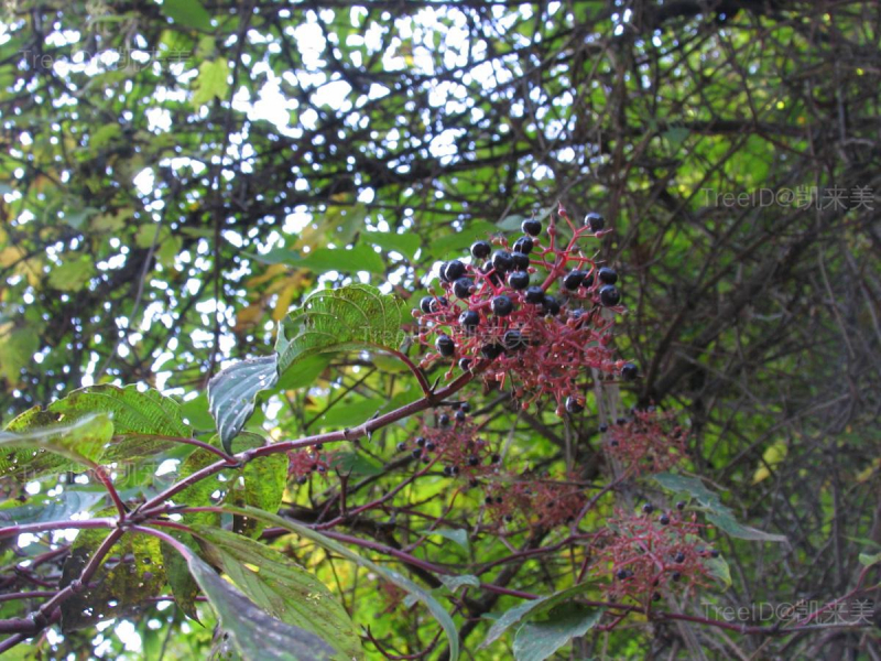 单叶对生,卵形或长圆形,长5-8.5厘米,宽2.5-6厘米,上面有短柔毛,下面密被白色短柔毛。伞房状聚伞花序顶生,被有贴生短柔毛;花小,白色;花瓣4。核果蓝黑色至黑色,近球形,密被贴生短柔毛。