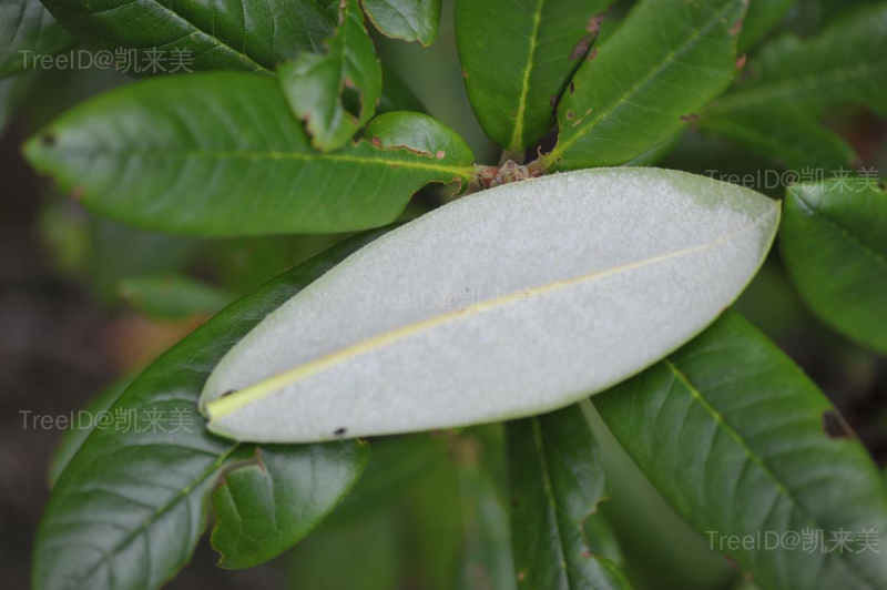 叶革质,椭圆形至长圆状卵形,长6.5-11厘米,宽3-5厘米,先端具短小尖头,边缘稍反卷,下面密被锈色毛;叶柄粗壮,长1-1.5厘米。