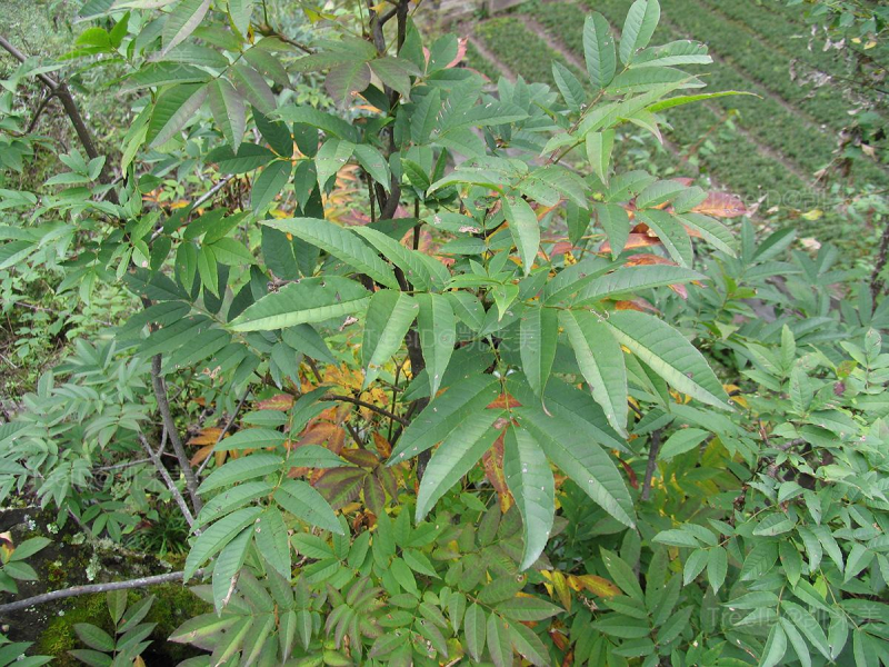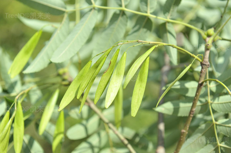 羽状复叶长10-25厘米;叶柄长5-6厘米,基部呈耳状半抱茎;小叶7-11枚,薄革质,长圆状椭圆形,长4-7厘米,宽1-2.5厘米,叶缘具不明显细锯齿。聚伞圆锥花序生于去年生枝上,长12-15厘米;花杂性异株,无花冠。翅果长圆状椭圆形,扁平,长4-5厘米,宽7-10毫米,近中部最宽。