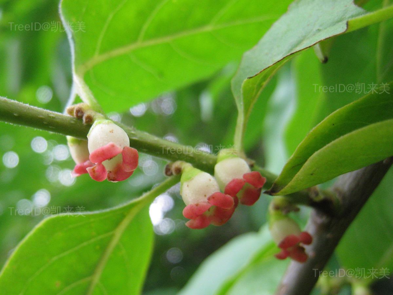 叶互生,长椭圆形,长6-12厘米,宽3-6厘米。花单性,雌雄异株,雄花1-3朵腋生,近无梗;花萼钟形,4裂;花冠壶形,带红色或淡黄色,4裂;雌花单生,几无梗,淡绿色或带红色;花冠壶形,4裂。果近球形或椭圆形,直径1-2厘米,成熟时黄褐色,后变蓝黑色,被白粉。