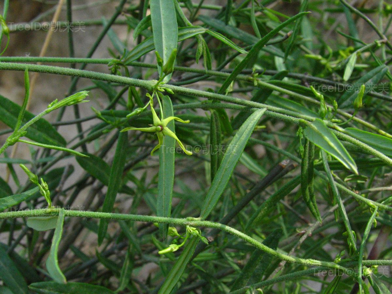 近伞形状聚伞花序腋生,着花4-7朵;花序梗极短或无;花小,绿黄色,直径约8毫米;花梗纤细;花萼裂片线状披针形;花冠裂片狭披针形,长5毫米;副花冠5裂。