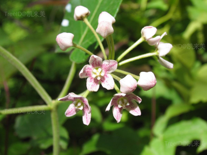 伞形状聚伞花序腋生,有花20余朵;花萼裂片卵圆形,花萼内面基部有5个腺体;花冠内面紫红色,外面白色,直径1-1.6厘米,裂片卵圆形;副花冠裂片肉质,肿胀。