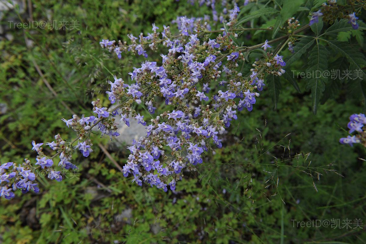 掌状复叶,小叶5片,间有3片,中间小叶最大,两侧依次渐小;小叶椭圆状卵形至披针形,边缘有缺刻状锯齿,浅裂以至深裂,背面密被灰白色绒毛。圆锥花序顶生;花萼钟状,顶端5裂;花冠淡紫色,外面有绒毛,顶端5裂,2唇形。果实球形,黑色。