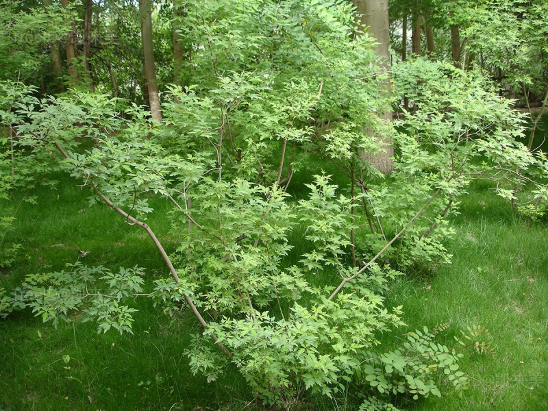 掌状复叶,小叶片边缘有缺刻状锯齿,浅裂以至深裂,背面密被灰白色绒毛。