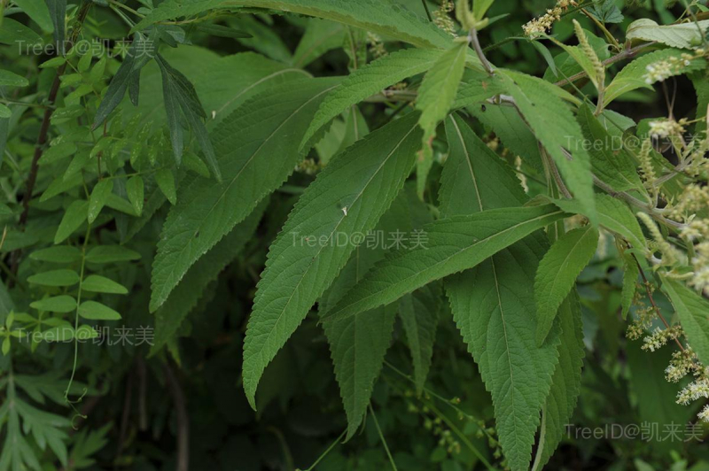 叶披针形或椭圆状披针形,长6-13厘米,宽2-3.5厘米,先端渐尖,基部狭楔形,边缘在基部以上具粗锯齿,近基部全缘,上面被糙伏毛,下面被短柔毛;叶柄极短或近无。