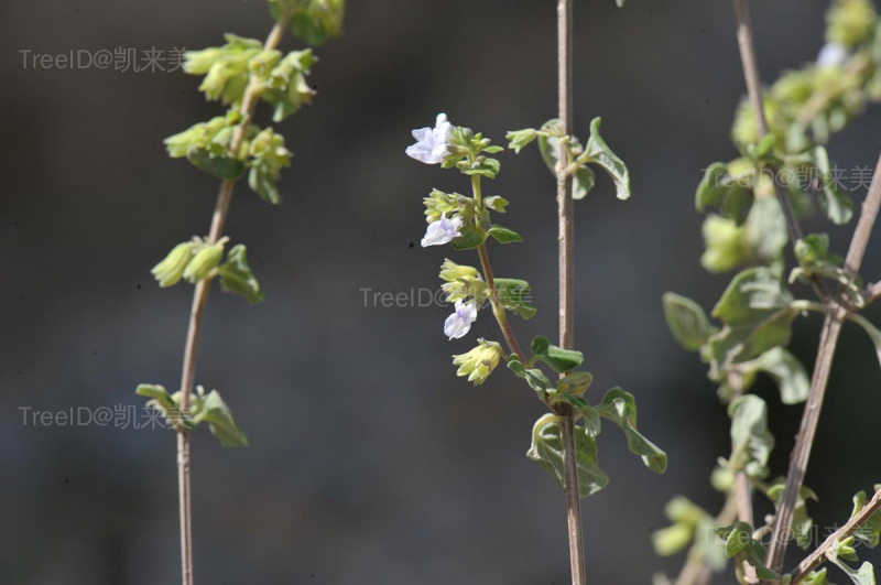 叶小,长圆状卵形或宽卵形,先端圆形,基部渐狭,全缘或具粗大圆齿,下面密被贴生短绒毛。聚伞花序腋生;花萼钟形,外面密被短绒毛,萼齿5,卵状三角形,花后增大,外折;花冠浅紫色,冠筒基部上方浅囊状,冠檐二唇形,上唇先端4圆裂片,下唇伸展,近圆形,内凹。小坚果小,褐色,光滑。