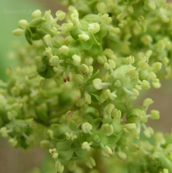 圆锥形聚伞花序顶生,长5-11厘米,宽4-14厘米;花小而密;萼筒杯状;花冠白色或淡黄色。
