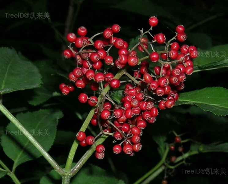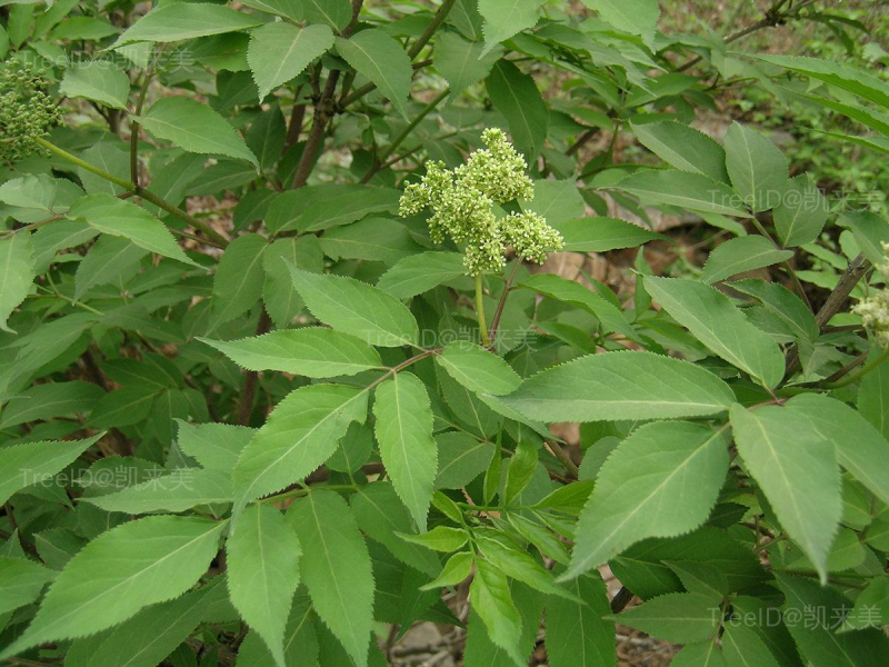 奇数羽状复叶具小叶2-3对,小叶片卵圆形至倒矩圆状披针形,具不整齐锯齿,基部常不对称。圆锥形聚伞花序顶生;花小,白色至淡黄色。浆果状核果近球形,熟时黑紫色或红色。