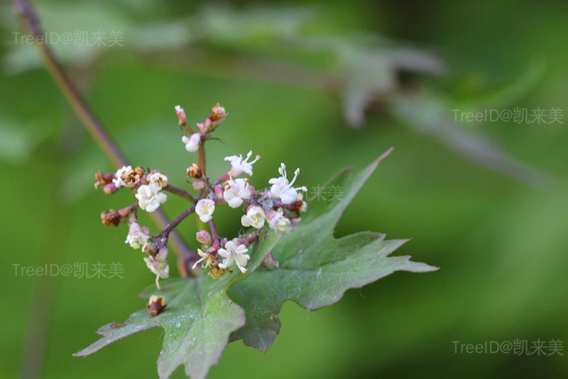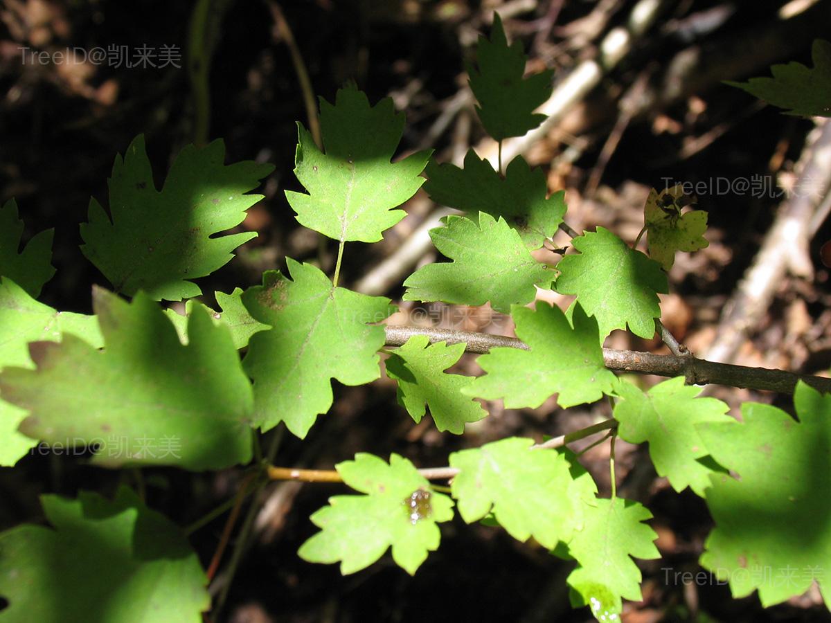 叶宽卵形至矩圆状卵形或倒卵形,长3-5 厘米,中3裂至深3裂或左右二裂片再2裂,掌状3-5出脉,基部截形至近心形,中裂最大,各裂片均具不规则粗牙齿;叶柄紫红色,长1-2.5厘米。