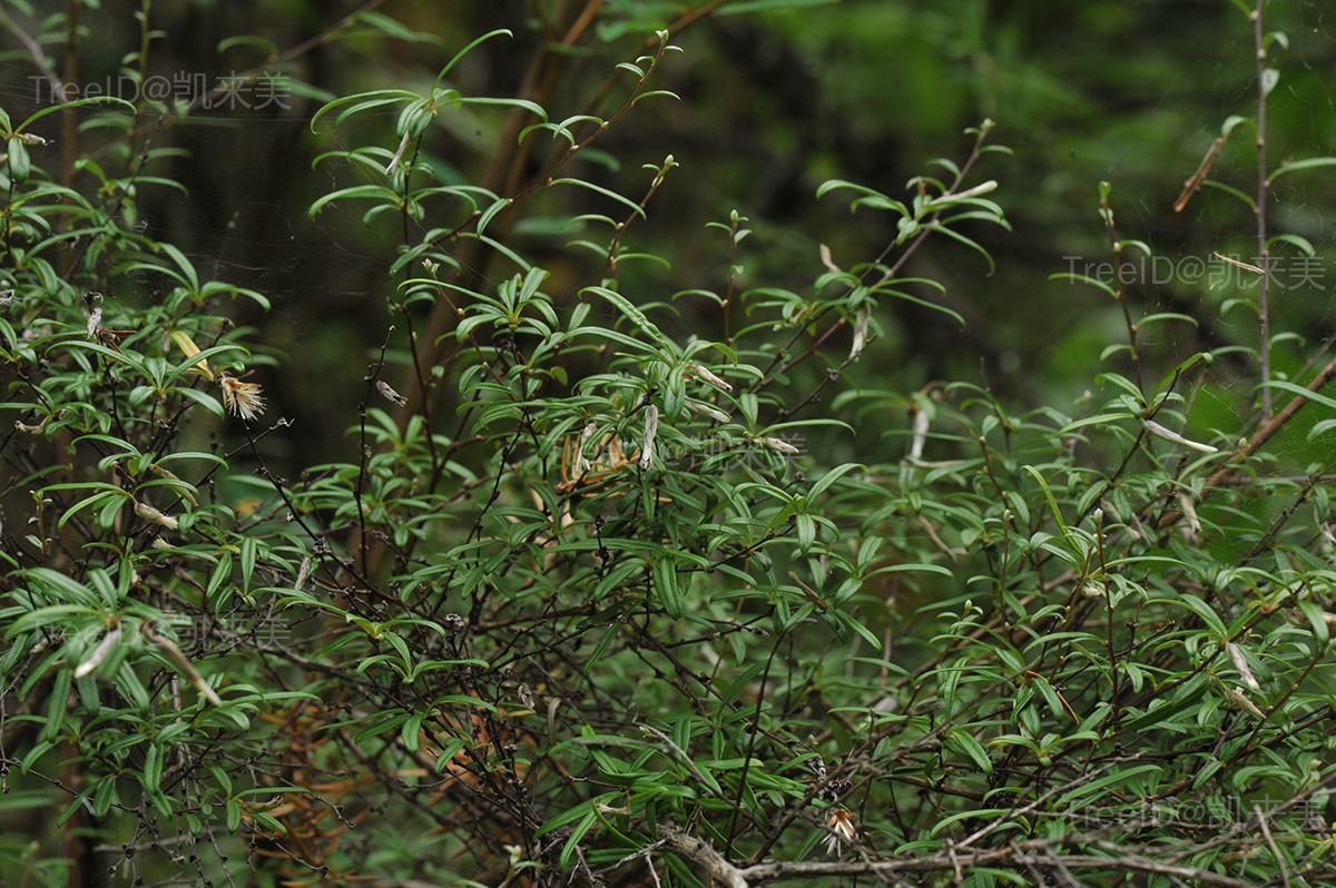 枝纤细,极多,呈帚状。长枝上的叶互生,线状披针形,长7-30毫米,宽2-4毫米,全缘,下面银白色,厚被绢毛;叶柄短;短枝上的叶3-4片簇生,披针形或倒披针形,长10-35毫米,宽2-6毫米。头状花序单生短枝;总花梗纤细,长2-5毫米。花紫红色。